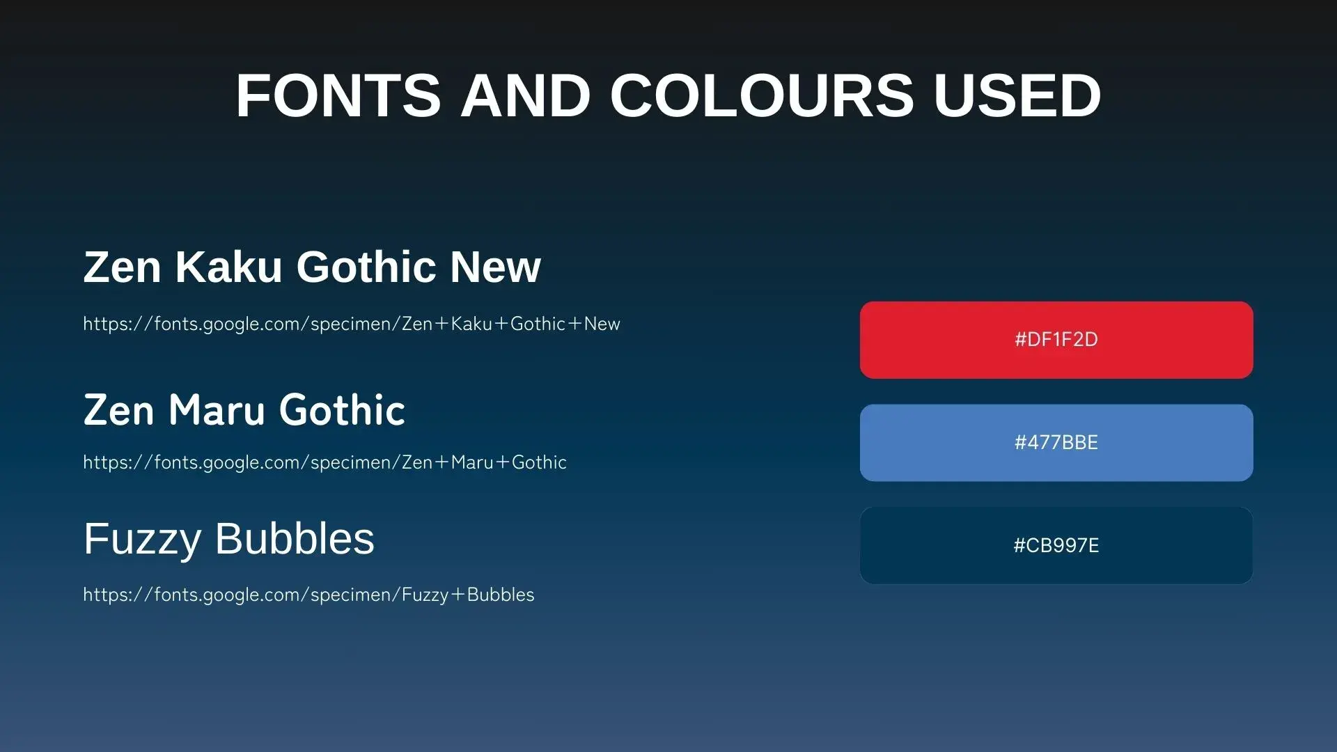 - Contains information about fonts, colors and credits of free resources used